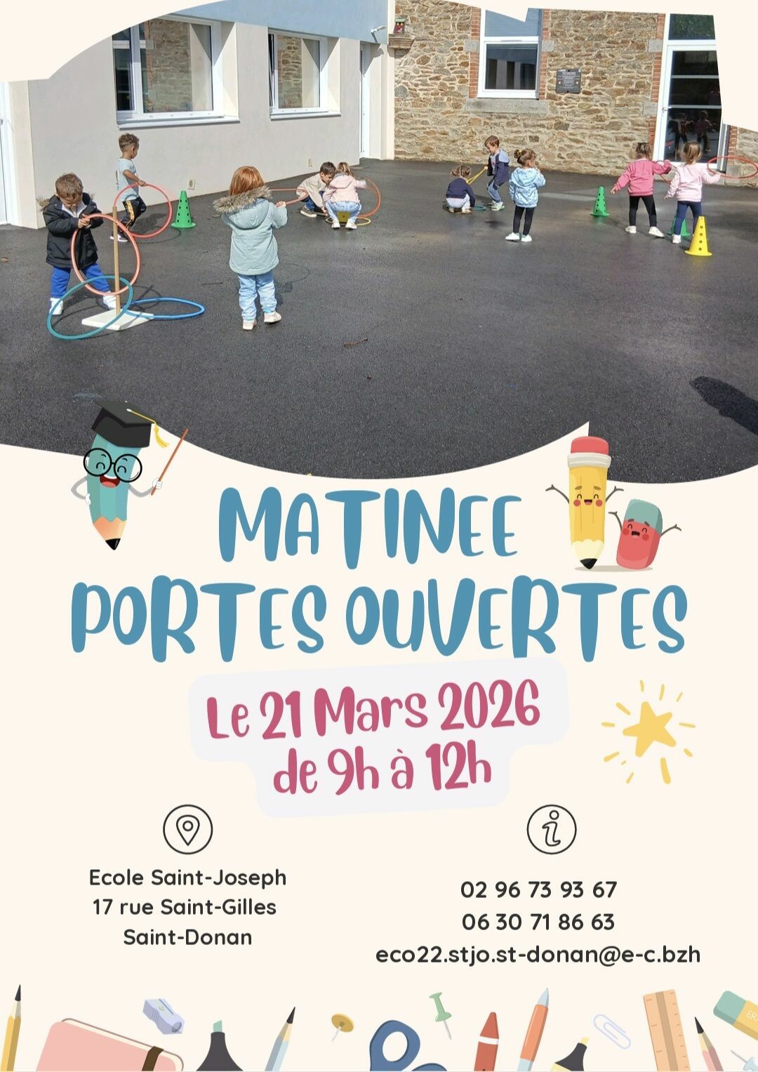 Venez découvrir l'école.Contact :Ecole Saint-Joseph7 Rue Saint-Gilles,22800 Saint-DonanTél : 02 96 73 93 67Mail : eco22.stjo.st-donan@enseignement-catholique.bzh
